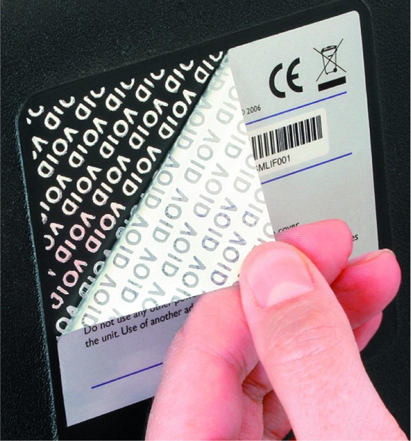 A etiqueta de segurança void quando removida, deixará impressa a mensagem: “VOID”, indicando que a caixa foi aberta ou adulterada. A mensagem de violação permanecerá impressa na embalagem e na etiqueta retirada.